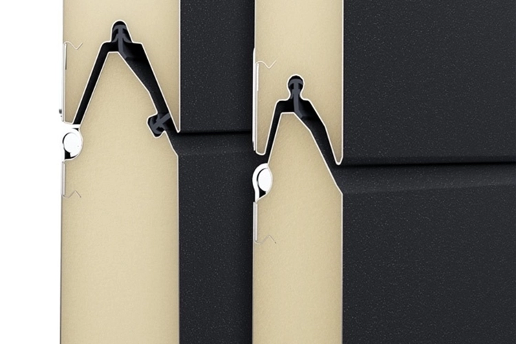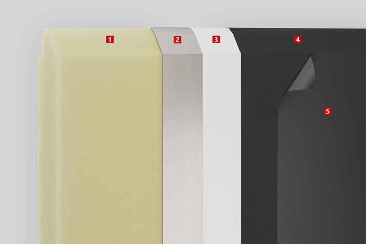 *1. Schaum, 2. Galvanisierter Stahl, 3. Kernschicht, 4. Polyester- oder PVC-Beschichtung, 5. Schutzfolie
